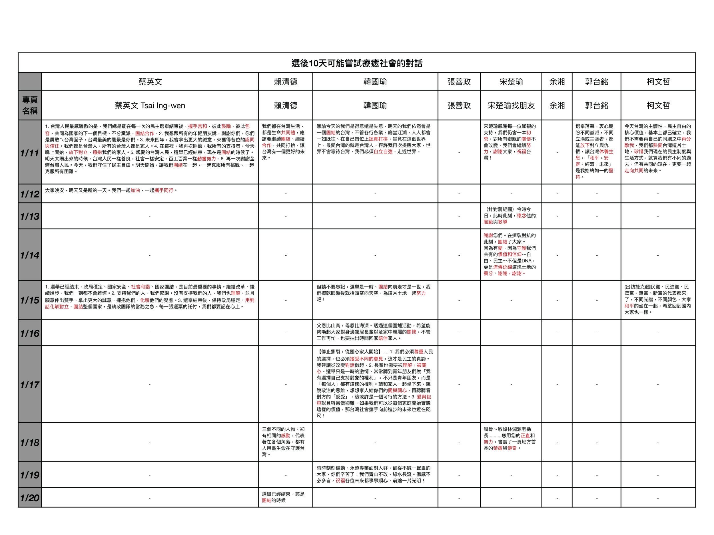 為了理解我們的政治精神領袖們在將近一年的廝殺後,是否有嘗試地帶領大家進入療癒,我們以過去總統大選中的重要人士為收集對象,針對其選後的10天內在個人官方社群媒體(臉書)上所發表的言論,作為個人行為產出的指標,進行盤點,並且表列出可能接近療癒的文字內容,作為我們理解這個命題的文本。相關的言論如下表: