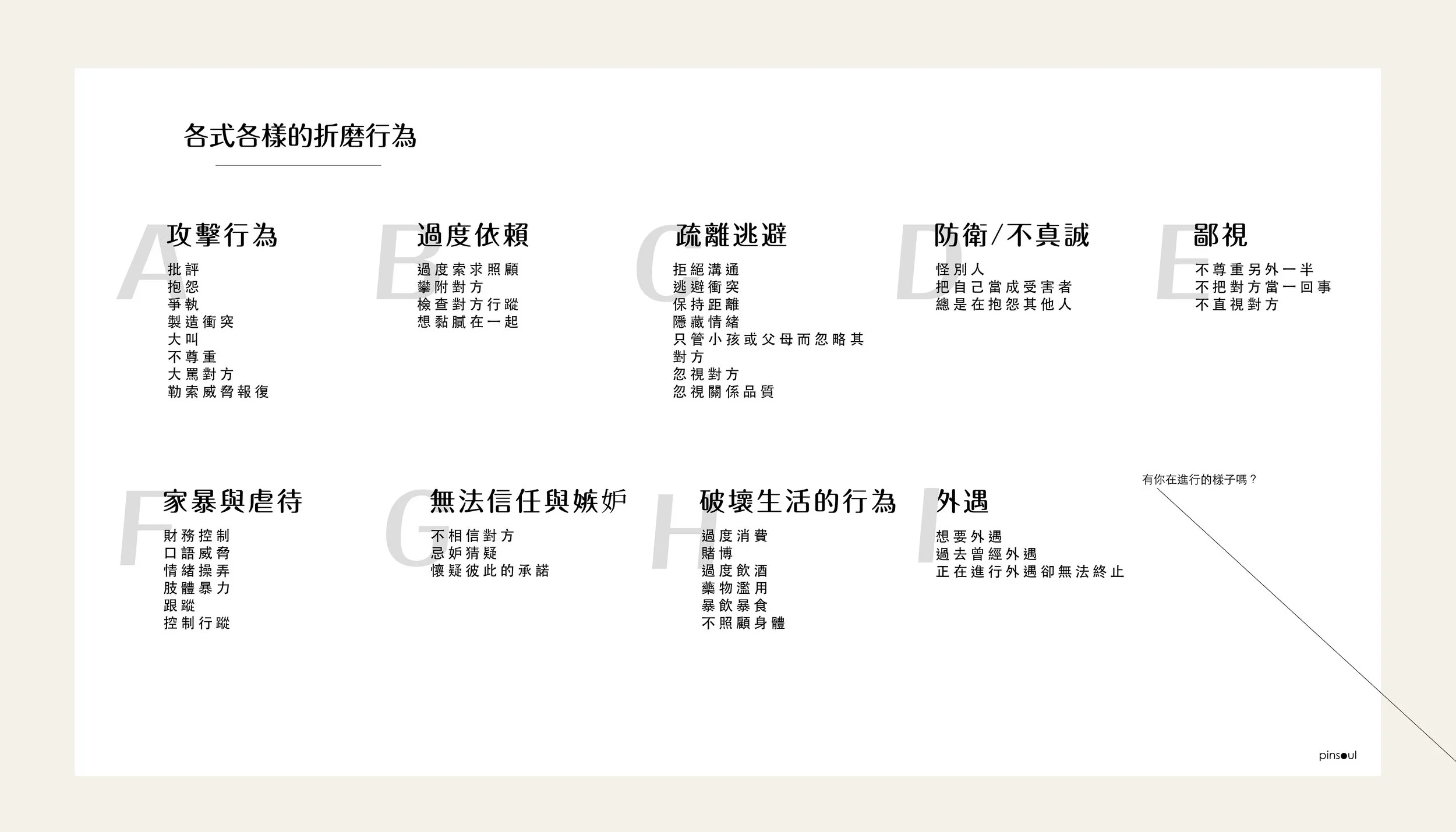 有些關係中的破壞,所產生的『折磨』可能是關係外的行為,可能會是某一邊的人大量的購買東西、賭博、喝酒,進行醫療行為讓關係走向無法信任的破滅狀態;也可能是某一邊的人在情感上外遇了,讓第三者介入了感情,而產生了一種『折磨』彼此的現況。但也有很多人的『折磨』狀態就是真的行動虐待,暴力相向,情緒操弄、口語威脅與暴力等等,伴侶間的虐待,是『折磨』中的『折磨』。