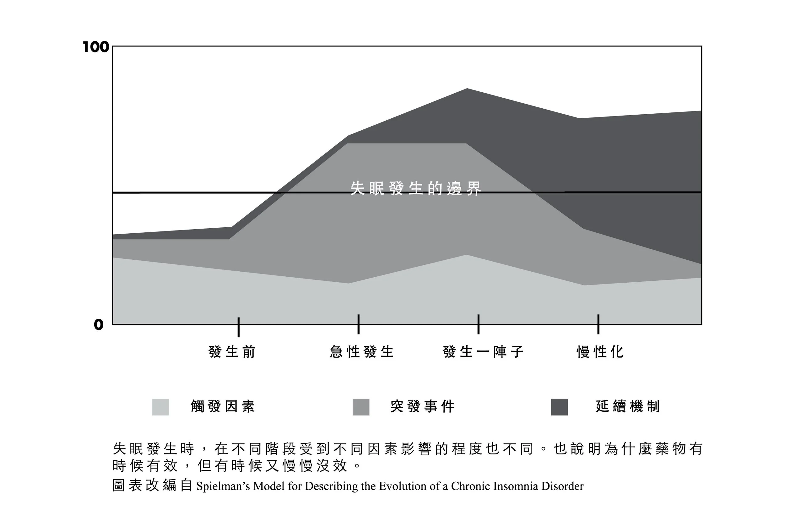 在我們生活中的諸多現象中,『睡不好』這件事情其實遠比我們想像中的複雜,而且蘊含更多意義。心理學家Spielman在他的理論中試圖去描述我們的失眠是如何慢慢發展慢性且難以克服的問題。跟許多心理疾病一樣,失眠的問題也包含三個因素的共同作用,包含:1. 觸發因素(predisposing factors)、2. 突發事件(precipitating events)、與3. 延續機制(perpetuating mechanisms);所謂的『觸發因素』就是我們常想到的體質、容易緊張擔憂的性格、大腦生理特徵等等,這些因素的存在讓我們比別人更容易發生『睡不好』的現象,而藥物有時候也像是在解決這個層面的因素;『突發事件』你可以把它想像成環境條件的改變,例如工作變多、生活發生變故、人際關係的衝擊失落等等,這些生活變動產生所謂的壓力,讓你一時間不再活得那麼順暢,也覺得有點身心俱疲的感覺。失眠的發生很多時候是前面這兩個因素交成影響的後果,但當失眠發生後,失眠會不會變成一個長期的問題,就會牽涉更多所謂『延續機制』的影響,這個機制就包含,我們平常的睡眠習慣、睡眠環境、對心情或睡眠的想法等等,而這也是我們常說的心理與行為的影響,也是失眠問題中,藥物較難碰觸的東西。這些因素的彼此在失眠的不同階段所扮演的角色,就像下面這張圖的感覺。