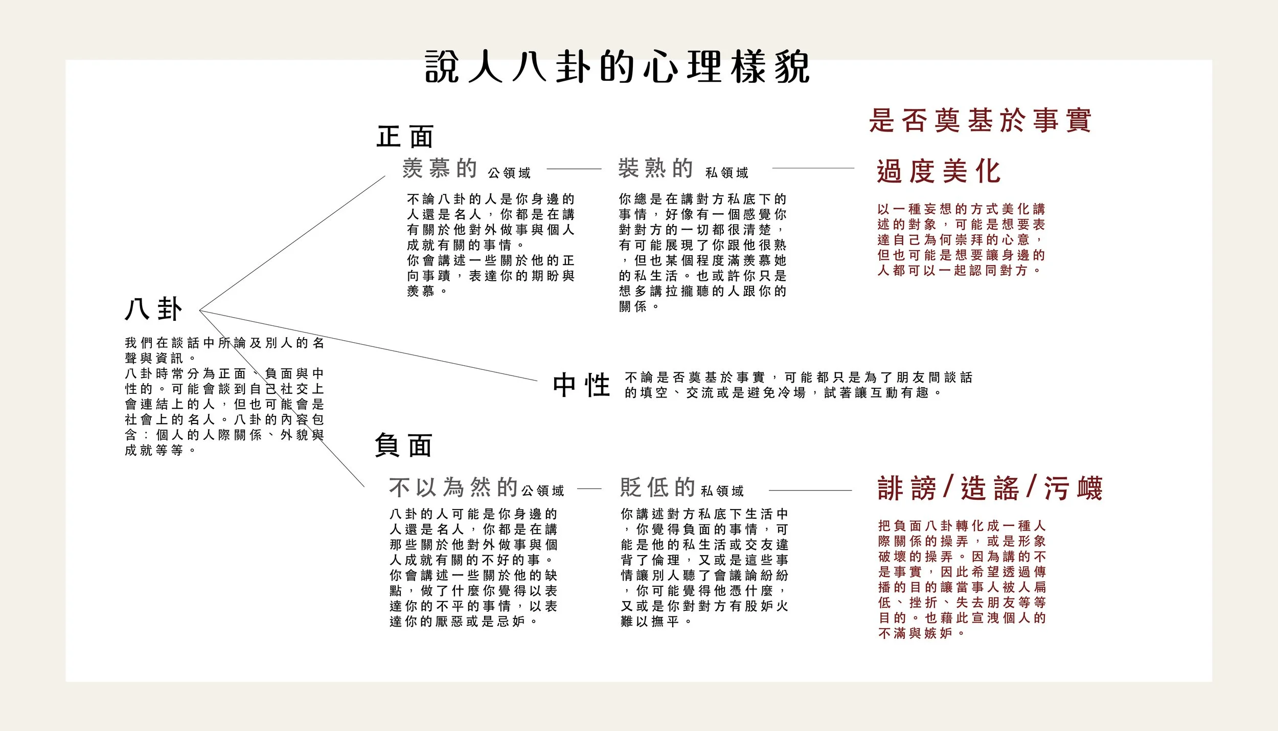 我們的八卦是否奠基於能夠確定的事實,也影響著這份八卦是否帶來影響或傷害,如果講的是別人真實發生的正面實績,那這個八卦好像讓你成了對方的信徒;但如果你講的八卦是你自己猜想的,那些負面的耳語,就著著實實成了陰謀論、毀謗、污衊,而到處亂講的你反倒成了霸凌對方的幫兇。